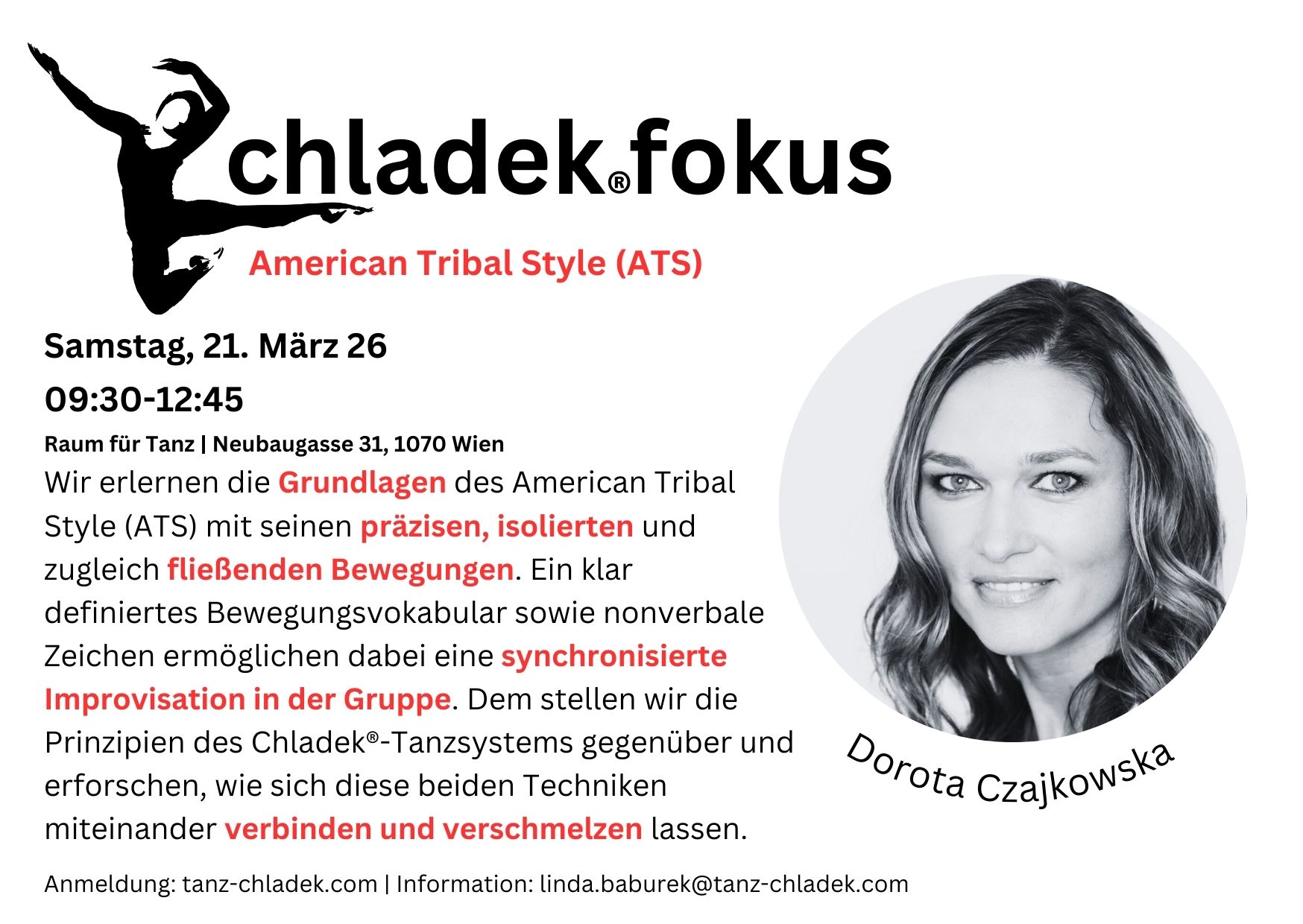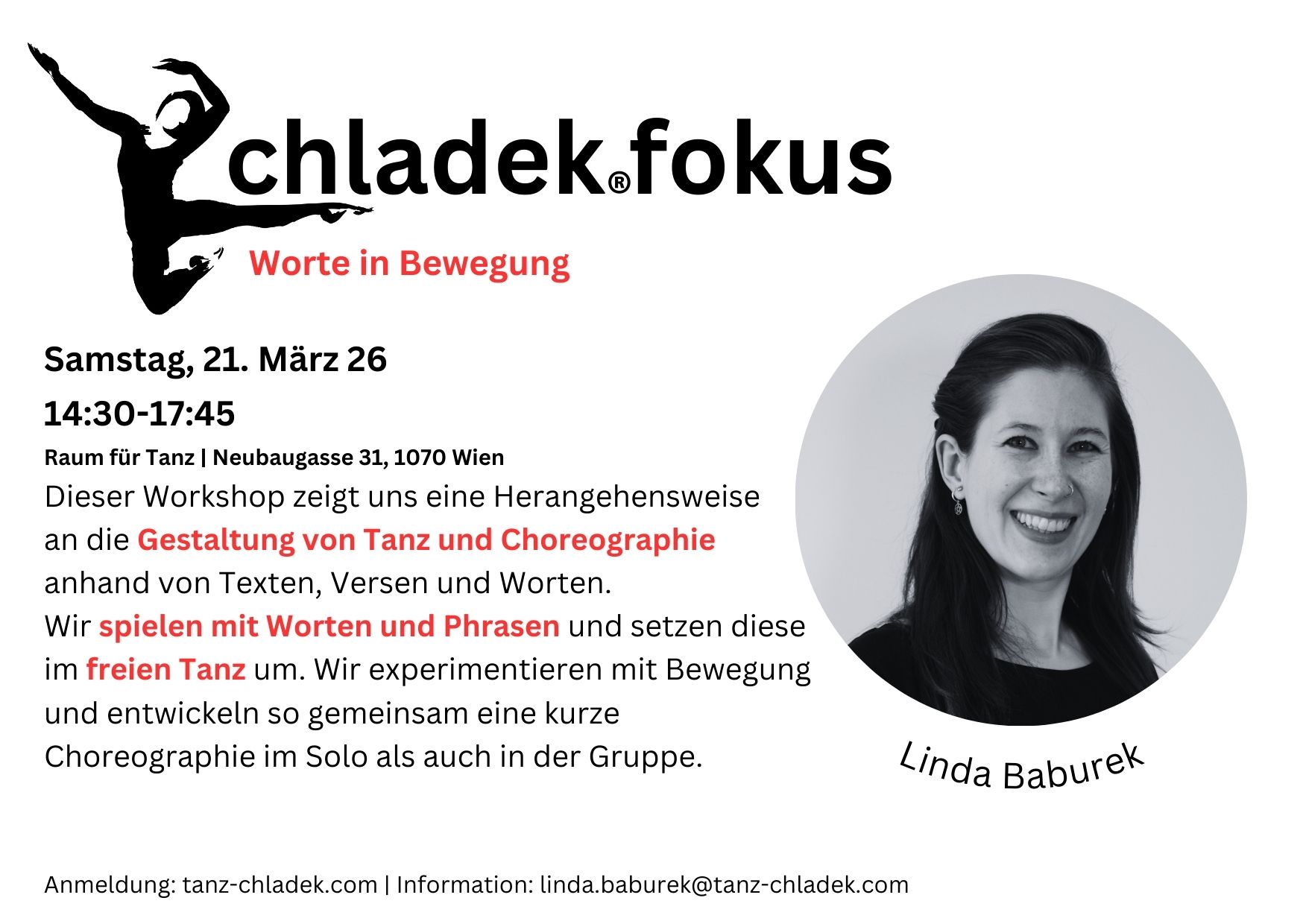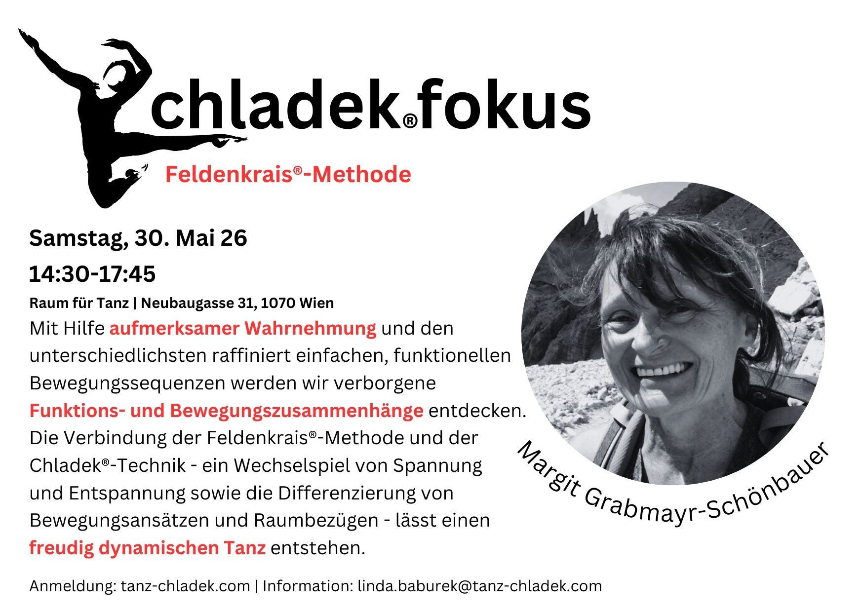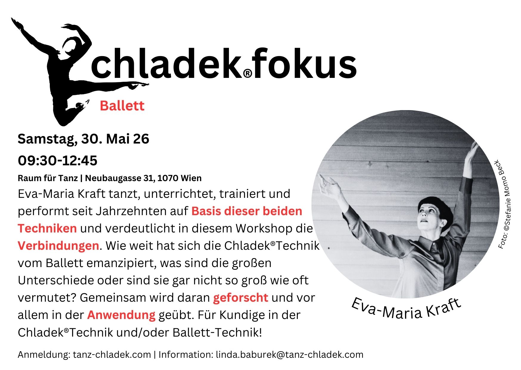 RAUM für TANZ I Eva Maria Kraft Neubaugasse 31 /im Hof, Wien, ÖsterreichChladek®fokus ist die neue Workshopreihe der Arbeitsgemeinschaft Rosalia Chladek Österreich / ÖARC.